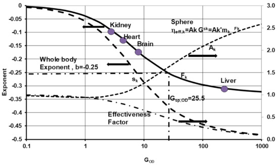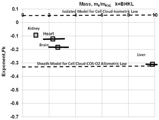 Similarly, the O2 consumption rate of an organ k of mass mk (e.g., liver) is estimated by measuring the blood flow rate along with the oxygen concentration at the inlet and exit of an organ (or saturation %), estimating the O2 consumption rate and then computing the ERRk () of each organ k. The specific metabolic rate (SMRk) of an organ k () is estimated using for many species with wide ranging body masses {mB}. The data for mk, vs. mB, are then curve fitted in terms of body mass (mB), called allometric laws in biology. The vital organs brain (Br), heart (H), kidney (K), and liver (L) perform life-sustaining functions [16]. The body mass based allometry (BMA} for and mk for vital organs are given below in terms of the empirical allometric constants and (Table 2, ref. [17]):