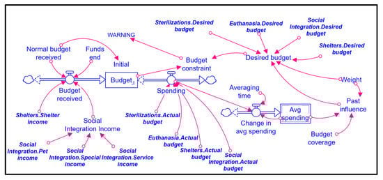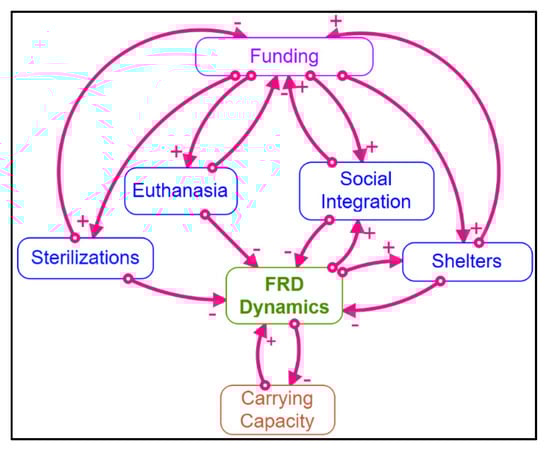 Figure 1 shows an aggregate map of the system represented in our model, which highlights four feedback loops between funding and the common and proposed policies in FRD management: sterilization, euthanasia, shelters, and social integration. For all policies, funding positively influences policy implementation; however, sterilization and euthanasia continuously deplete funding through a negative feedback process, whereas the social integration and shelter policies enhance the funding source through a positive feedback loop.