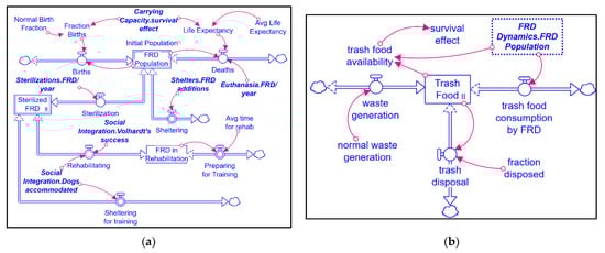 The system dynamics model presented by Saeed in [], based on Bangkok’s FRD problem in the 1980s, offered a novel approach for FRD management in contrast to the failed city-wide castration policy. The model defined FRD as a “manifestation of a latent capacity support system” and showed that HDM, such as discarded food, established the FRD carrying capacity in the system []. Results showed that a trash disposal or reduced trash generation policy has better effectiveness for FRD management because it removes the food availability support structure, thereby reducing the FRD birth rate and life expectancy. Although this policy has been considered an effective alternative to conventional policies that aim to directly eradicate or sterilize Indian FRD populations, which often cause mortality and welfare problems due to inadequate funding, reducing the carrying capacity in the system through waste management also gravely threatens FRD welfare, unless additional measures are taken to shelter/remove FRD [].