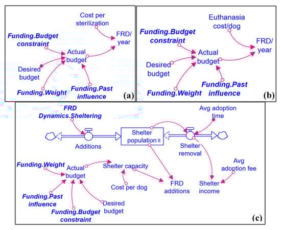 Depending on the user-defined desired budget for sterilization, the budget constraint from the funding module and weighted influence from past financial decisions factor in to calculate the actual budget for sterilization in Figure 3a. Using the location-specific cost per sterilization procedure, the number of FRD sterilized per year is calculated. Similarly, the user-defined euthanasia budget is adjusted by the budget constraint and weighted by past influence to determine the actual euthanasia budget in Figure 3b. The number of FRD to be euthanized per year is calculated using the location-specific cost per euthanasia procedure. The user-defined desired shelter budget is adjusted by the budget constraint and weighted by past influence to obtain the actual budget for shelters, which is divided by the comprehensive shelter housing cost per dog to yield the total shelter capacity in Figure 3c. The FRD additions flow, calculated based on available capacity in the shelter system, determines the extent of the sheltering flow from the FRD dynamics module when the shelter policy is activated. The annual shelter income is determined by the anticipated rate of adoption and user-defined adoption fee.