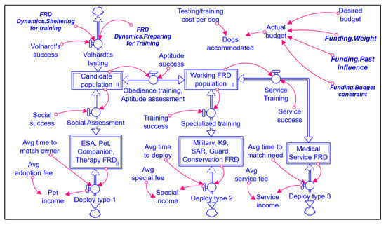 The user-defined desired budget is constrained by the budget constraint and weighted past influence, while the number of FRD accommodated, or annual training batch size, is determined by the location-specific average testing/training cost per dog. FRD enter the Volhardt’s testing process from shelters or training preparation, based on their prior rehabilitation needs. The Volhardt’s aptitude and temperament testing process establishes a candidate population stock, from where FRD undergo either a social assessment or an obedience training and aptitude assessment depending on the Volhardt’s test results, which will categorize the FRD based on characteristics of companionship, protection, and competition. FRD that succeed will become emotional support animals/companion/pet/therapy dogs or a part of the working FRD population, including military, K9, SAR, guard, conservation, or medical service FRD. Deployment rates will vary based on the average time needed to match owners, law enforcement agencies, and medical needs, while income for further FRD population management will occur via adoption, special services, and medical services.