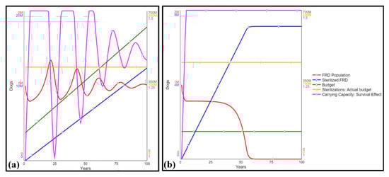Sensitivity analysis was conducted with an initialized FRD population of one million, to find the minimum annual sterilization funding that would cause an ultimate decrease in the FRD population over a 100-year time frame, instead of eliciting repeated goal-seeking behavior. As shown in Figure 6b, an annual budget of INR 130 million is required, for an ideal INR 1000 (USD 13) per sterilization procedure, to overcome this cyclical behavior and decrease the population. For a population of just one million, 55 years are needed to reduce the population to 101,000, or approximately ten percent of the original street population, although the subsequent decrease is significantly faster. For both conventional policies, however, a budget must be provided consistently throughout this significant number of years, with no supporting avenues of income and/or societal benefits other than reduced human–dog conflict.