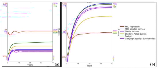 Implementing a shelter policy is a more humane alternative that can generate revenue through FRD adoption and will ultimately support itself through adoption income. The policy can be optimized using methods that adjust the upkeep cost per FRD, the shelter’s average FRD adoption time, and the shelter’s average adoption fee. However, due to the historically limited financial returns from this policy, and generally higher upkeep cost of FRD and infrastructure needs in comparison to the one-time sterilization and euthanasia procedures, the FRD population shows similar goal-seeking behavior unless significantly higher and unrealistic levels of annual funds are applied. With the average adoption time set at 3 months, and an ambitious adoption fee of INR 5000 (USD 67) to offset an INR 5000 yearly cost per FRD, Figure 7a shows how providing a steady INR 130 million funding program, as well as adding each year’s shelter income, results in a goal-seeking pattern. Although the shelters’ financial gains reach up to INR 129 million (USD 1.7 million) per year, it is still inadequate to push against the balancing feedback established by the survival effect from the carrying capacity module, and eventually leads to a stabilization of all values. In Figure 7b, a reduced INR 3000 (USD 40) maintenance cost per FRD is tested alongside the same adoption fee of INR 5000, with other parameters kept the same as before. Despite reaching a maximum shelter income of INR 648 million (USD 8.7 million), the FRD population entirely bounces back to one million from a minimum point of 954,000, due to the increasing survival effect. It should be noted that shelters in India currently provide all FRD adoptions for free and, thereby, require external donations to support all shelter costs. Despite allowing FRD adoptions free of charge, shelters are almost always overburdened with FRD and are struggling to provide space and support for additional FRD in need of medical help and rehabilitation.
