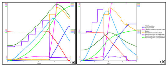 Activating and maintaining a social integration policy for (a) six years, instead of (b) four years, results in greater budget availability, income from social integration, and approximately double the number of FRD deployed, as well as reducing the FRD population within the same time.