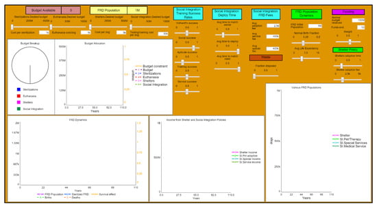The interface graphs depict the budget breakup, budget allocation and constraint, FRD dynamics, income from the shelter and social integration policies, and working FRD populations successfully being deployed. This model was calibrated using the Indian FRD case study, and therefore shows the currency in rupees (INR). The aim of the program is to lower the main FRD population as quickly as possible, with the highest overall income from training and the highest number of various working dog populations at the end.
