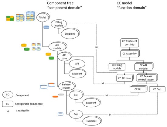 A CC model of a treatment is established herein. A traditional design of a tablet along with the primarily considered design requirements, dose strength, target release profile, and size serve as inputs for establishing the CC model. These design requirements provide a foundation for the functionalities that a pharmaceutical product should embed, and these are expressed in FRs, which are further realized as DSs. Cs serve as means to constrain the functioning bandwidth of any FR and their consequent DS. Cs, furthermore, describe the nonfunctional requirements, the scalability of the dose strength, the flexibility of the target release profile, and the scalability of the treatment size. The CC model is complemented by a component tree of the pharmaceutical product to give physical realization to the configurable objects in the model.