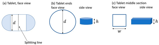 (a) Illustrates the commercial tablet from the face view. (b) The end sections are displayed from the face and the side. (c) The middle section is displayed from the face and the side.