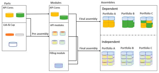Modules are defined as elements that serve as an input into the final assembly step and are to be transformed into assemblies. The assemblies are the treatments provided to patients. Modules are API cores, API modules, and filling modules. It must be noted that API cores are considered both parts and modules since these can either be used for generating API modules or can be directly transferred into assemblies.