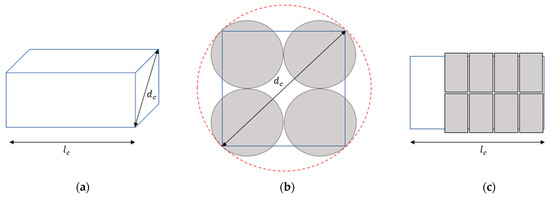 At the bottom of the cuboid, the modules are packed in arrangements of four, as displayed in Figure 5b. This type of arrangement is called a module stack for convenience. The arrangement of a module stack fit within the periphery of the capsule, verified by calculations based on the diameter of the core, 2.4 mm, and adding the thickness of the walls of the cup (i.e., 2 × 0.5 mm). The module stacks are stacked on top of each other along the length, , dimension of the cuboid (see Figure 5c).
