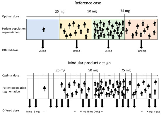 Mass customization, as a production paradigm, has the intent of increasing business performance by serving a wide range of customers with customized products, through efficient production [6]. Three mass customization principles described by Hu et al. [7] incorporate product family architecture, reconfigurable manufacturing systems, and delayed differentiation. Govender et al. [4] projected these into the pharmaceutical context as product modularization, process reconfiguration, and postponement. Product modularization in a pharmaceutical context is, to some extent, present in the literature. Siiskonen et al. [8] have suggested an initial approach to product modularization of pharmaceutical products using function modeling, by which two product design requirements, originating from patient needs, were integrated into the product: a scalable dose strength and product size. For these modular product designs, cost and benefit studies were conducted. Govender et al. [9] and Govender et al. [10] experimentally showed the realization of a modular product design for a pharmaceutical product with a scalable dose strength and flexible, but controlled, target release profile. Building on the studies by Siiskonen et al. [8], Govender et al. [9], and Govender et al. [10], the novelty of this paper is a theoretical modeling approach to generate modular product designs for pharmaceutical products for cost-efficient customization. The earlier work is extended by integrating three product design requirements into a customized pharmaceutical product: scalable dose strength, target release profile flexibility, and scalable treatment size. The scope of this study considers pharmaceutical products embracing the dosage form of a tablet, which is the most common dosage form [5,11,12]. This study will not consider the design of the molecules of the active pharmaceutical ingredients or excipients. Furthermore, to assess the value to the patient of these modular product designs, models for benefit and cost are suggested and applied. The research questions guiding this study are RQ1: How can individual product design requirements be realized in a pharmaceutical product for customization? and RQ2: How can the cost and benefit of customized pharmaceutical product designs be assessed?