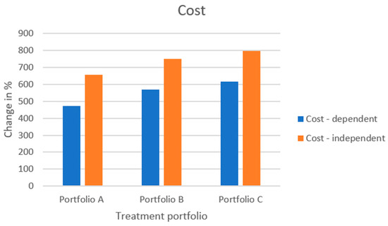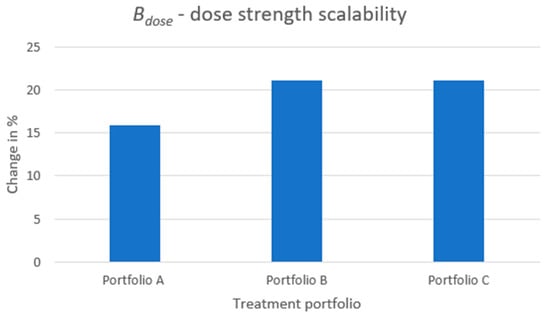 Table A1 displays the resulting raw data on assessing the resulting performance of each treatment portfolio, reference case, A, B and C, for both the dose-dependent and -independent scenarios. The resulting performance is assessed for the benefit-metrics, , and as well as the cost-metric, .