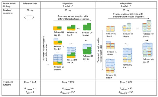On the highest hierarchical level, i.e., within the CC treatment portfolio, the Cs dose range and release range describe the viable range of both properties and, hence, essentially define the dose strength scalability and release flexibility of the treatment portfolio. The C size range informs the allowed sizes of any treatment and thus describes the extent of size scalability.