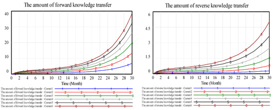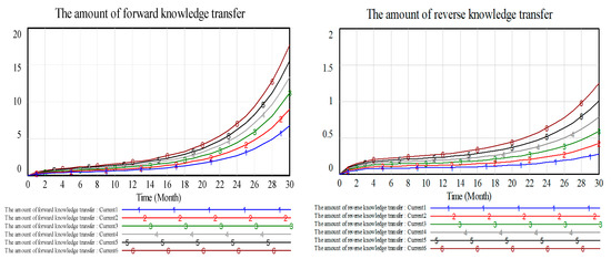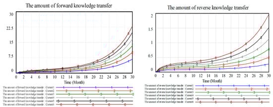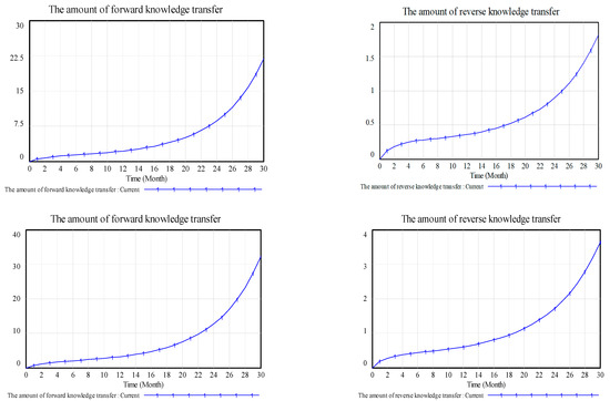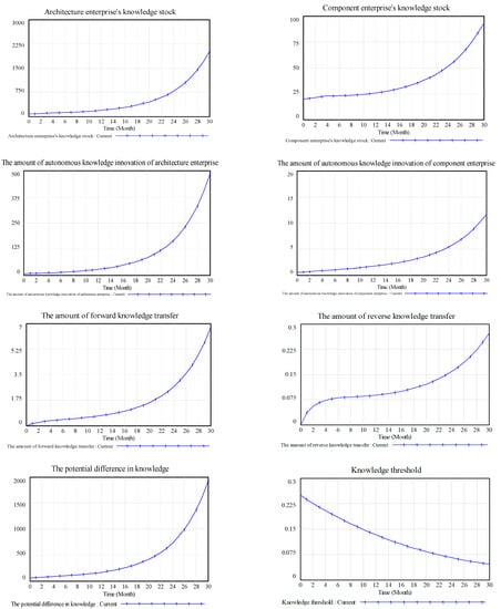 | L1 = INTEG (R1 + R2 − R3, 80); L2 = INTEG (R4 + R5 − R6, 20); L3 = INTEG (R7 + R8 − R9, 0); | The initial value of the knowledge stock of the architecture enterprise is set to 100; in general, the knowledge stock of the component enterprise is smaller than that of the architecture enterprise, so the initial value of the knowledge stock of the component enterprise is set to 20; if no knowledge transfer occurs between the component enterprise and the architecture enterprise and there will be no knowledge stock in the innovation system, so the initial value of knowledge stock, in this case, is set to 0. |