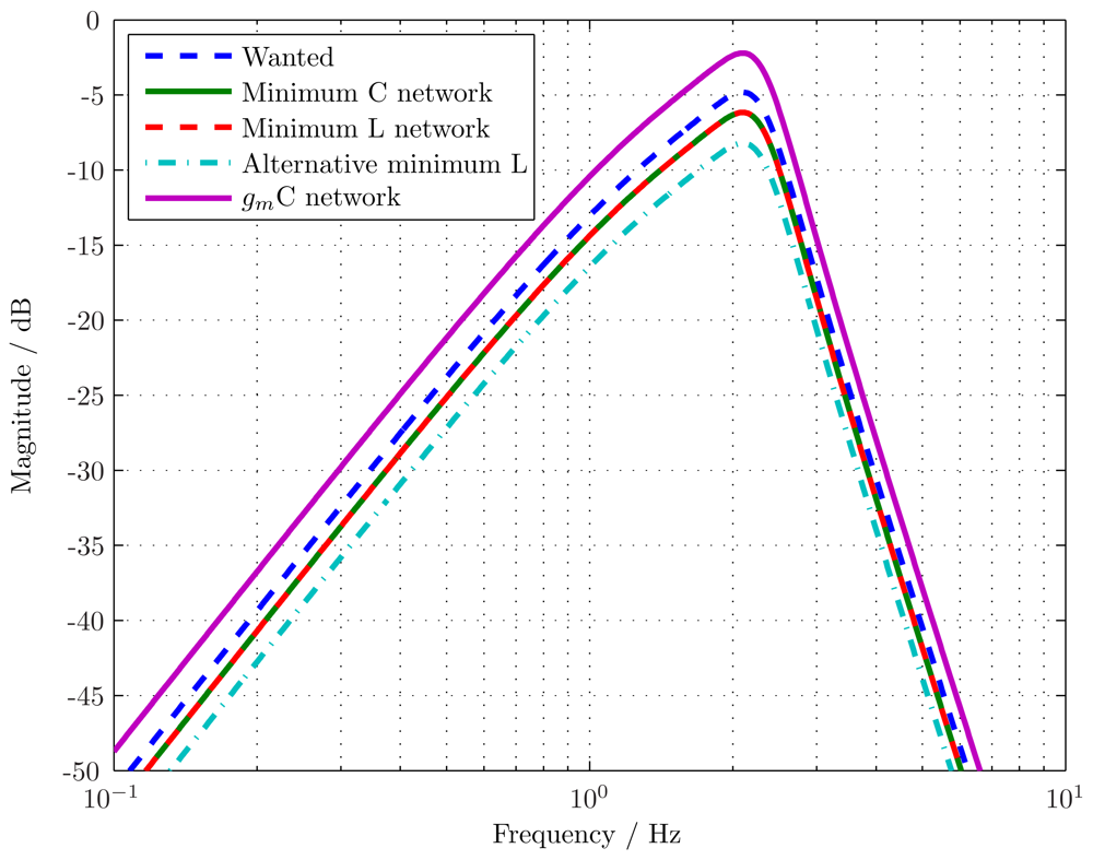 which can readily be achieved on-chip. Again, due to the low 2.1 Hz centre frequency of the transfer function considered the transconductance required is low, at 100 pS, but can be realised [,]. Higher centre frequency filters will require higher transconductance values.