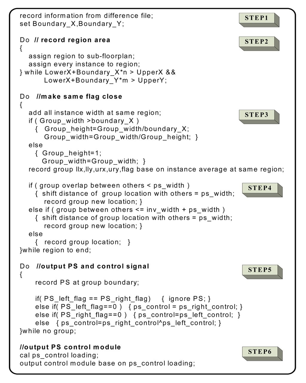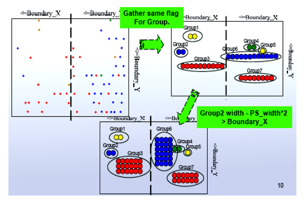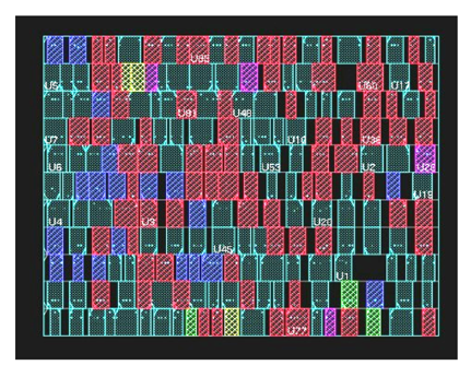 The physical implementation design uses the free placement algorithm implemented by commercial tool. The VDP example placement, under different delay time constraints is shown in Figure 11. The free placement algorithm allows global cell distribution under the lowest interconnection delay time. The merging operation moves the same flag logic cells together to a same row or neighboring rows, as shown in Figure 11. This logic cell merging process might increase the interconnection delay. Figure 12 shows the same flag logic cell merging algorithm.