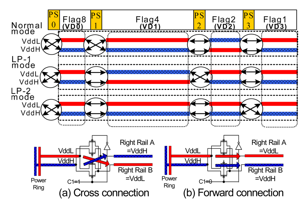 The proposed dual suppliers VD programmable design is shown in Figure 5. High (VddH) and low (VddL) voltage (e.g., 1.5 V and 1.2) is used simultaneously. In the conventional low-Vdd technique, the VD size is fixed, several performance-power management modes are adopted for adjusting the voltage level from two different power supplies.