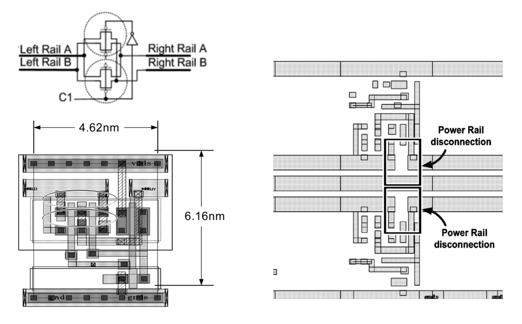 Each logic gate can select two supply voltages (VddL or VddH). In the cell library, the layout of VddL rows is in Metal-1, and VddH is in Metal-3, as the Metal-1 and Metal-3 rows overlap in the vertical direction. Hence, there is no additional area in comparison with the single voltage cell library. The power rails need the correct connection in each row. Figure 14 shows the PS control interchange connections of neighboring power rails.The PS are used to support the logic cells connection to the correct supply voltage or to bypass the same row power rail connection. The PS disconnection function allows the cell isolated from its neighboring cells to use a different voltage source, as shown in Figure 15.
