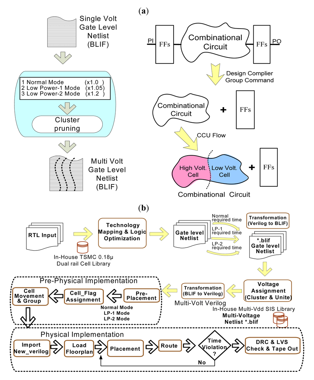 Figure 16b shows the VDP front-end and back-end design flows. The VDP design flow includes in-house EDA tools as well as commercial logic synthesis and physical design tools. The in-house EDA tools are written in C, SIS, and PERL programming languages. The kernel voltage domain assignment program was developed using SIS.