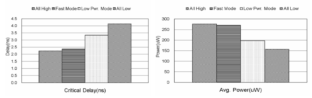The following experiment demonstrates the VDP design details of performance-power management ability. The delay time and power consumption are partitioned into four modes in Figure 17. The voltage assignments are VddH = 1.8 V, and VddL = 1.8 V for the All-high mode, VddH = 1.8 V, and VddL = 1.2 V for the high performance (fast) mode and the low power modes, and VddH = 1.2 V, VddL = 1.2 V for the All-low mode. With the VDP technique, the low-power mode uses a greater number of VddL gates than does the high performance mode. From the postlayout simulation comparisons, the VDP power consumption and delay time can be graded. The simulation results show the test circuit delay time and power consumption can be clearly classified. This means that the VDP is an effective power-performance management technique.