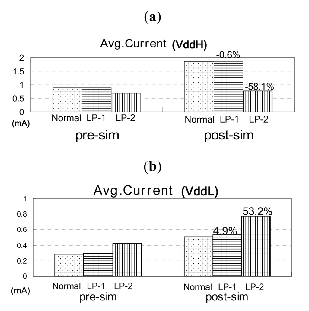 For the power consumption comparisons, consumed current comparisons for VddH and VddL are required. The current amount shows that the LP-2 mode uses more VddL gates than do Normal and LP-1 modes.