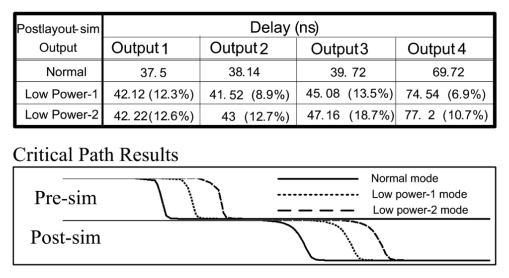 After the test chip physical implementation, the output4 waveforms of the post layout simulations are shown in Figure 20. Comparisons of the circuit delay times of the three modes were carried out. From the longest output signal (output4), the LP-1 mode circuit delay time is 6.9% larger than that of the Normal mode. The LP-2 mode delay time is 10.7% larger than that of the Normal mode.
