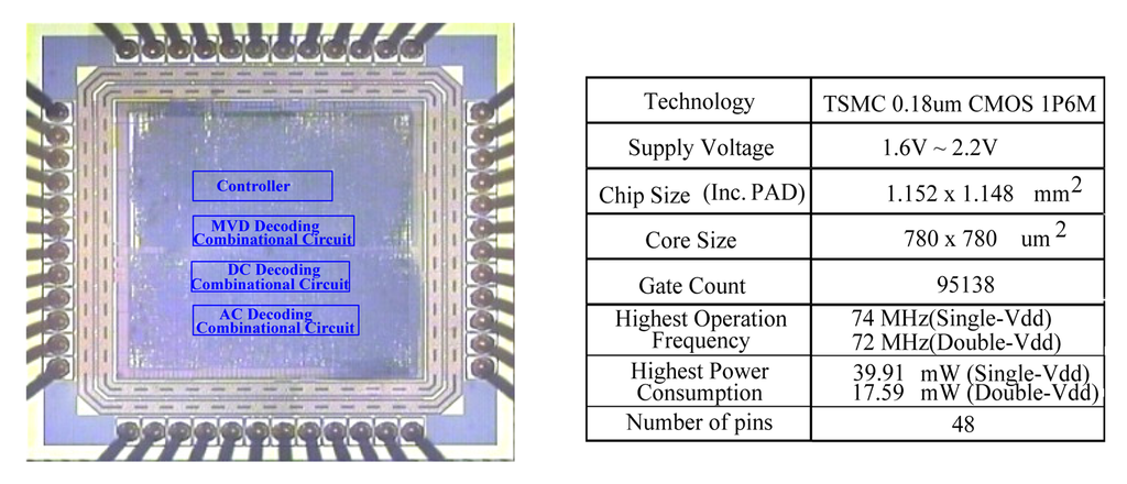 Figure 21 shows the die photo and specifications of the MPEG VLD test chip that uses TSMC 0.18 μm CMOS technology. The chip function proof of this novel methodology to show significant decreases in power consumption and is successful in power-performance tradeoff applications.