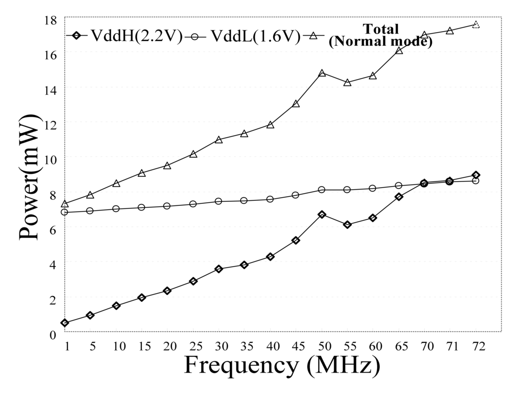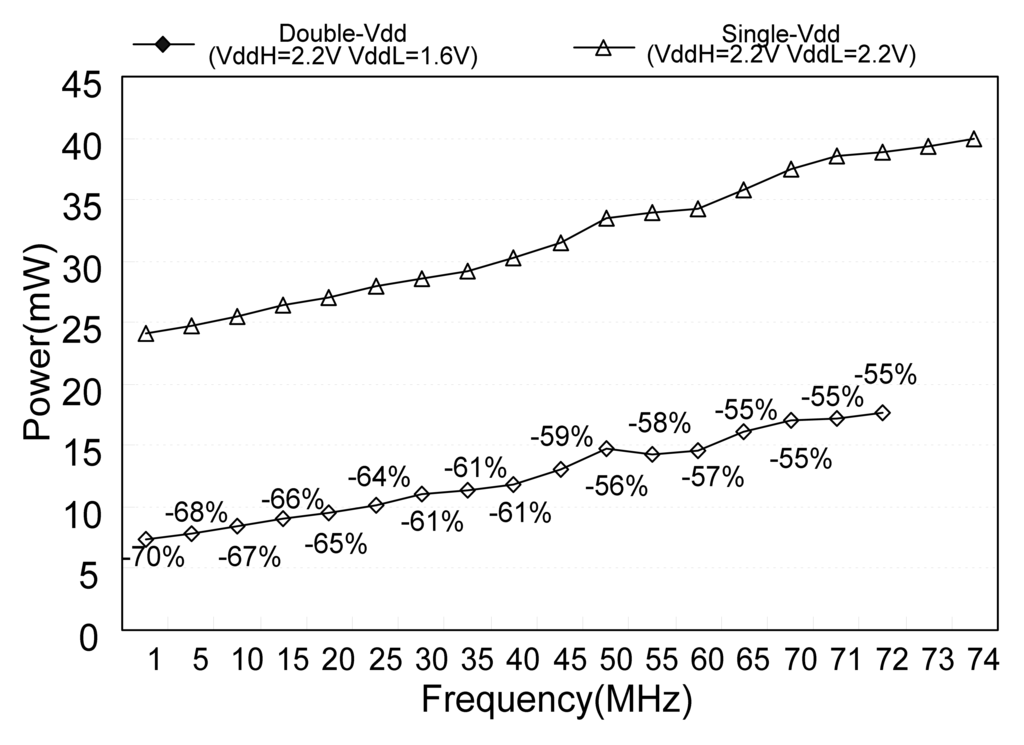 Figure 22 shows the power consumption with respect to Single-Vdd and Double-Vdd. Single-Vdd uses single voltage source (i.e., VddH = VddL = 2.2 V). Double-Vdd uses two voltage sources (i.e., VddH = 2.2 V and VddL = 1.6 V). The VddH and VddL connect to individual outer power supplies. Test chip power consumption is computed by (VddH × IVddH) + (VddL × IVddL), where IVddH and IVddlL are the average currents of VddH and VddL outer power supplies, respectively. The power consumption of Double-Vdd technique is reduced 55% compared to that of Single-Vdd technique. However, the highest operation frequency in Double-Vdd technique is a little lower than that of Single-Vdd technique.