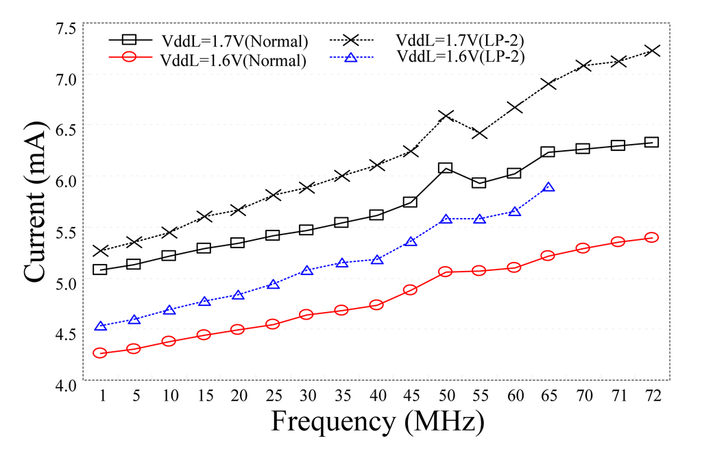 Figure 25 shows the comparisons of the test chip using different VddL in different modes. When VddH = 2.2 V is fixed and the VddL decreases from 1.7 V to 1.6 V, compare to Normal mode, the highest working frequency of LP-2 mode is lower than 9.7%, the current consumption is lower than 13.5% at 65 MHz, the performance and power consumption can be clearly differentiated. For Normal mode, fewer gates use VddL, and there is no difference in performance. The current consumption for LP-2 mode shows a reduction of 17.2%. Hence the VDP and supply voltage shrinking mechanisms can be joined together, utilized by changing operational mode to obtain lower power consumption without performance lost.