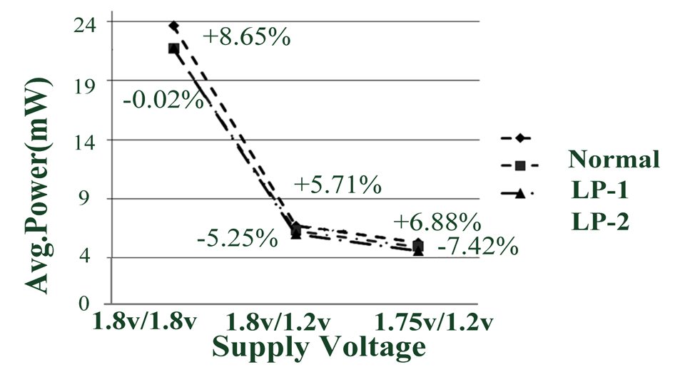 In the Normal (performance) mode, more gates require higher levels of supply voltage and more current consumption from the VddH. When the chip selects the LP (low-power) mode, current consumption of VddH power supplier is decreased from the few gates using the VddH, but the current consumption of VddL power supplier is increased. The VddH current values are degraded when the operation mode is switched from Normal mode to LP-1 and LP-2. However, the VddL current values are increased.