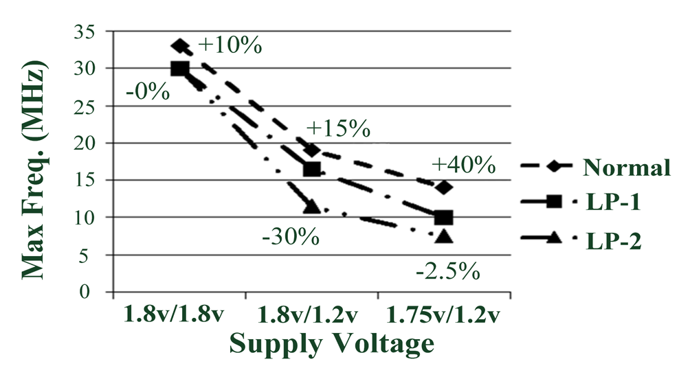 In Figure 27, in comparing maximum circuit working frequencies, Normal mode has a 15% higher working frequency than LP-1 mode, and LP-2 mode has 30% lower working frequency than LP-1 mode at VddH = 1.8 V, VddL = 1.2 V. There is 45% circuit performance interval within Normal and LP-2 modes. This figure shows circuit performance is dependent on the VddH voltage level. When degrade the VddH voltage level to 0.05 V, the performance degraded by 57% at Normal mode. Higher VddH allows the test chip to work at higher frequency than using Higher VddL.