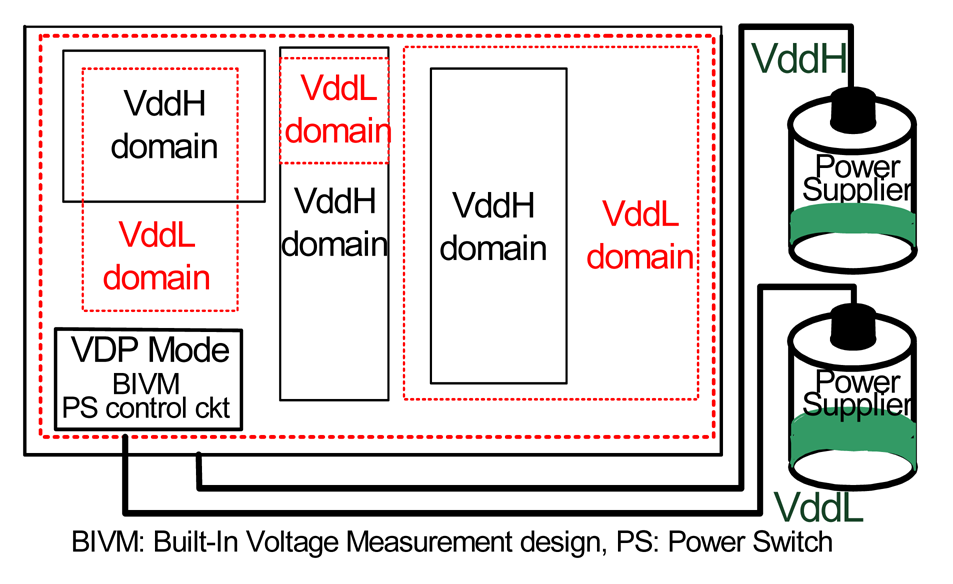 In the VDP design, the VD sizes of VddH and VddL are adjustable when the circuit changes to different operational modes. If a few gates located on the critical paths use VddH and most gates use VddL, there is lower power consumption in this VDP design. For an application example, when the VddH power source is enough (above a certain voltage level), the system operates in performance mode. When performance operational circuit quantities increase, the VddH voltage level degrades is detected by the sensor. The internal power management mechanism switches deigned circuit to low-power mode, allowing fewer gates to use VddH and more gates to use VddL, which increases the utilization balance of these two power supplies. The system level power management mechanism follows the voltage level, as measured by a built in voltage management circuit, to arrange a suitable operational mode which keeps the designed circuits functioning in the best performance-power situation.