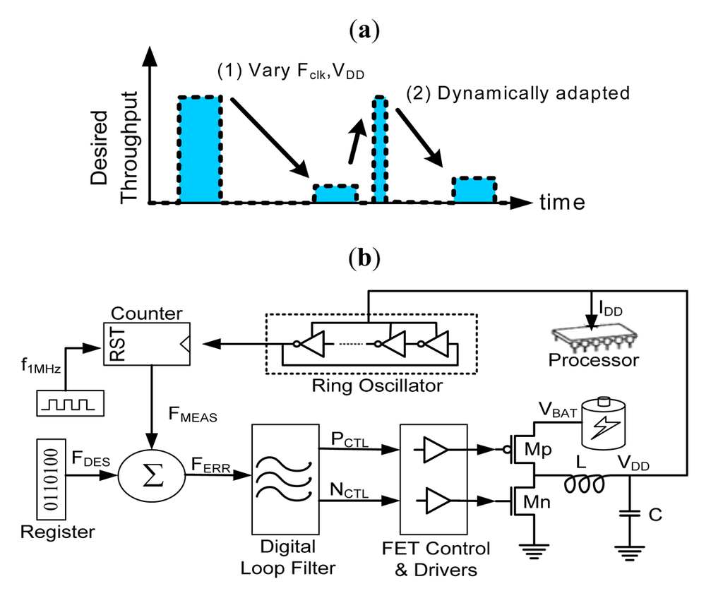 The conventional dynamic voltage frequency scaling system. (a) Dynamic Voltage Frequency Scaling (DVFS) adapts voltage and frequency rating from the throughput; (b) DVFS system structure