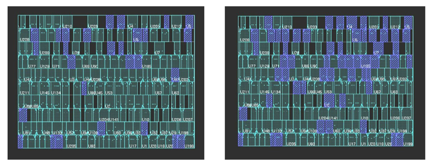 After the different delay time constraints are defined for the designed circuit, The United-circuit operation is executed during the chip's physical design stage. The logic gates and LCB are preplaced concurrently. The physical design stage uses the free placement algorithm implemented by commercial tools. The VDP example circuit placement results are shown in Figure 9. The blue cell represents a VddL gate. The VddL gate number is increased when the delay time increases (as the dash lines show two region comparisons). The free placement algorithm allows cell global distribution under the lowest interconnection delay time. Hence, the logic cells and LCBs location distributions are freedom controlled by physical design tools. The logic gates and LCB physical locations of Normal, LP-1 and LP-2 circuits are memorized for continued processing requirements. Figure 10 shows the three type placement results are merged into a single placement. The different colors represent the assigned flag numbers for their respective gate which can be mapped one by one to United-circuit.