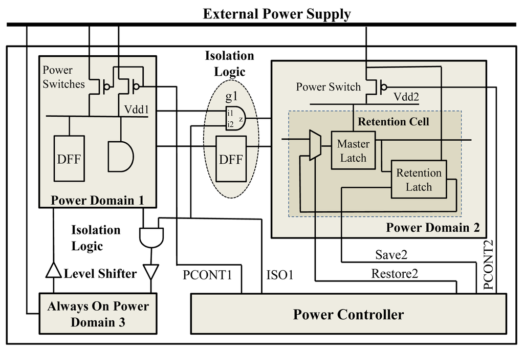 - Multiple supply voltages: Depending on operation conditions, a power domain can be operated under different supply voltages. The power domains operated at different supply voltage levels are connected through level shifters.