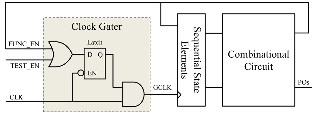 Figure 3 shows a typical clock gater architecture embedded in a design. During shift, TEST_EN is asserted in order to allow CLK pass through the clock gater to shift the scan chains. During capture, TEST_EN is deasserted and the clock gater is controlled by its functional enable pin FUNC_EN. To reduce the capture power, the test generator can deassert the FUNC_EN if the sequential state elements controlled by the clock gater are not used to activate, propagate, and/or observe targeted faults. In order to effectively control the clock gaters during test generation, the sequential state elements controlling FUNC_EN should be scan cells.
