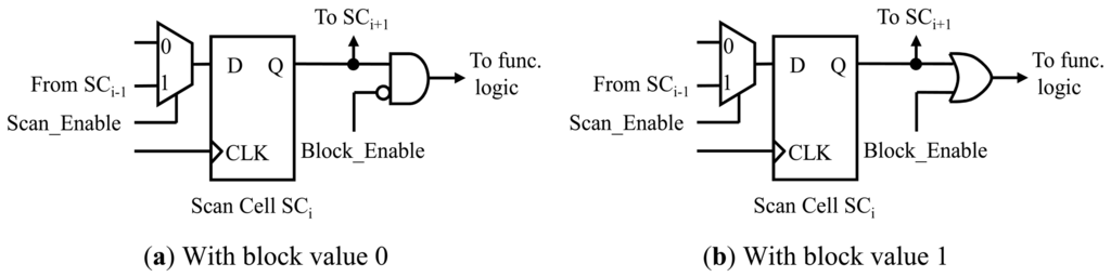 Since the switching activity at the combinational logic in a design is caused by the state changes at the sequential state elements, the test power consumption in the data paths can be reduced by blocking the transitions occurred at the sequential state elements propagates to the combinational logic during shift or capture. Two implementations of gating the scan cell output to be 0 and 1 are shown in Figure 5a,b, where an AND gate and an OR gate are added as the blocking gate, respectively. By asserting Block_Enable signal, the transition occurred in the scan cells is blocked. During normal operation, this signal is de-asserted.