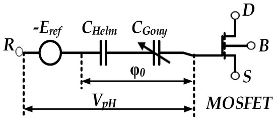 Where R is the reference electrode, D is the drain, S is the electrolyte–insulation source, B is the substrate, and refers to the potential of the electrolyte–insulation interface. The expression of can be written as follows: