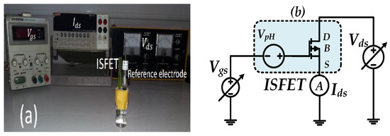 (a) Experimental setup using the ISFET sensor, (b) ADS circuit simulation using the ISFET model.