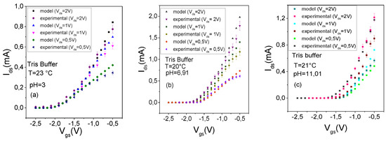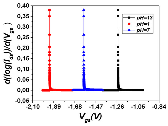 where is the potential applied to the reference electrode, is the electrostatic potential, which is directly proportional to pH and temperature, is the Boltzmann constant, is the absolute temperature, is the pH-zero point of charge, is the electron charge, and is the corrective parameter for pH–ISFET, which ranges between 0 and 1. The electrochemical properties of the insulating surface were combined with the nonlinear current-voltage (I-V) MOSFET, resulting in an expression of the threshold voltage of the ISFET, including terms derived from the MOSFET theory as well as terms of an electrochemical nature [26]: