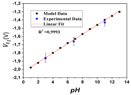 As seen in Figure 6, the determined sensitivity based on the ISFET macro model simulation (i.e., has approximately the same the sensitivity, which was calculated based on the experimental data (i.e., . In fact, the experimental ISFET characteristics were validated against the implemented macro model in order to accurately predict the pH values.