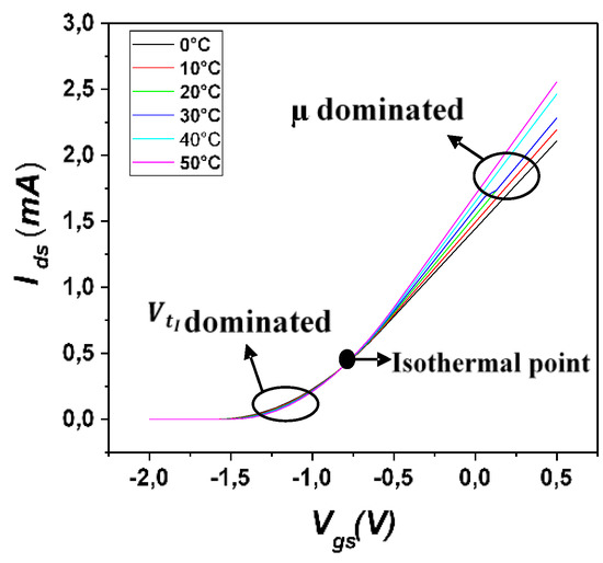 It is worth noting that by analyzing Figure 7, the drain current of the ISFET macro model varies considerably with the temperature. It deteriorates with an increase in temperature. This behavior is dominated by two phenomena: the degradation of the mobility and the shift of the threshold voltage , which result in the offset of the gate-source voltage below and above the isothermal point, respectively.