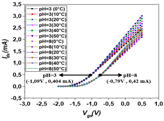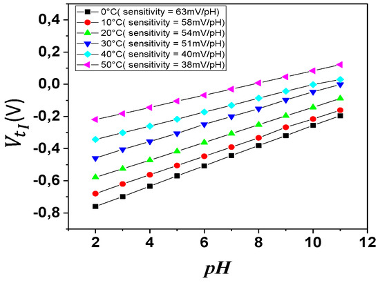 Figure 9 demonstrates the variation of the threshold voltage as a function of pH over a wide temperature range. The shifting of the threshold voltage also results in the degradation of the sensor sensitivity for high pH values when the temperature varies from 0 to 50 °C. From visual inspection, the sensitivity of the sensor linearly varies with respect to the temperature, which is reported in Table 2.