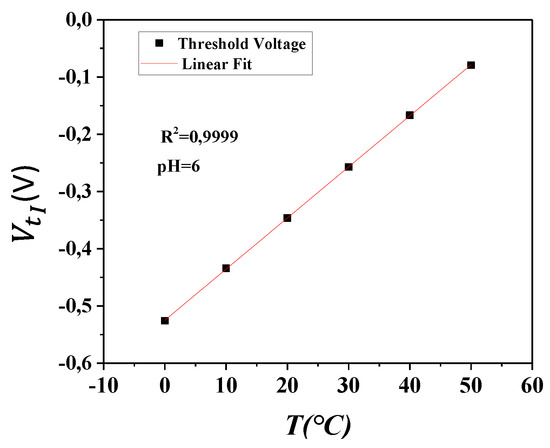 The presented data in Figure 10 were extracted from Figure 9, and present the traces of the threshold voltage for pH = 6, when the temperature varies from 0 to 50 °C. Figure 10 also illustrates the dependence of the ISFET sensor on the temperature about 10 mV/°C (nearly 20% of sensitivity is affected by temperature).