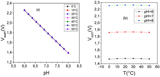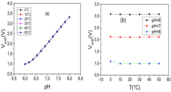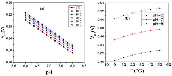 For = 4 and = 9.2, Equation (19) varies between V/°C and 14.03 V/°C for Therefore, we can assume that the temperature has no significant effect on the output voltage. The estimated temperature coefficient for pH = 6 is about 9.43 V/°C.