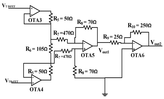 This section analyzes the conditioning circuit architecture. The differential ISFET-based pH measurement is shown in Figure 11 and Figure 12. In fact, the ISFET sensor is used in a conjunction that is sensitive to a specific species (such as H+) and a reference field effect transistor (ReFET), which is insensitive to this species. ReFET was introduced to minimize the drift effects and the noise on the measurement. Both sensors must have the same electrical and chemical characteristics. A ReFET would experience a similar condition as an ISFET except the chance of responding to an occurring chemical reaction [33]. The ISFET/ReFET topology can be implemented in two configurations. The first configuration is to fabricate a REFET similar to ISFET but with a different membrane [2]. The second configuration is to make the REFET/ ISFET completely similar, but insulated and exposed to another analyst where no reaction may happen [34]. However, in addition to the DC offset problem that may bias the ISFET and REFET out of the active region causing the circuit to stack to the power-ground rail, the gate drain capacitance may distort the sensor response. The drain node is unmaintained, and it cannot follow the gate. Hence, with the Miller effects, the gain between the drain and the gate terminals of the deferential topology cause the appearance of the decoupling capacitors on the floating gate, and this may distort the signal. Nevertheless, to overcome the random DC offset, most of the ISFETs require a calibration of the reference electrode; ISFET/ReFET topology may also require more calibration between the ISFET and the reference FET, which makes it a little bit complicated for implementation in the ISFET arrays [2,35]. To overcome these limitations, the presented circuit in Figure 11 presents a solution for ISFET/ReFET topology. The feedback made by the amplifiers (OTA 1 and OTA 2) can control the calibration of the reference electrode to overcome the DC offset and make it easier the implementation of the ReFET/ISFET for the deferential measurement.