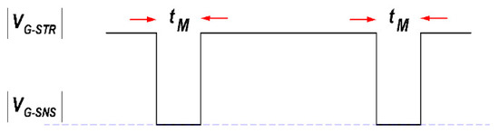All measurements were carried out at high temperature, 150 °C, and with mV, to achieve low drain bias and to keep oxide field ) approximately constant across the channel during the application of stress [9]. The following measurement method consists of three main phases: the initial stabilization phase, the stress phase, and the recovery phase. The degradation in SiC power n-MOSFET drain current can be frequently checked in the gate stress. The initial stabilization phase is performed by applying a negative gate voltage: −5 V for 10 s. In this phase, the virgin device is stabilized by releasing the charges enclosed in trapping centers. The determination of the BTI-induced, parametric degradation of MOSFETs is frequently done by stressing the device at an accelerated aging condition, through a suitable gate bias ( that is larger than than the one used during ordinary operation [13].