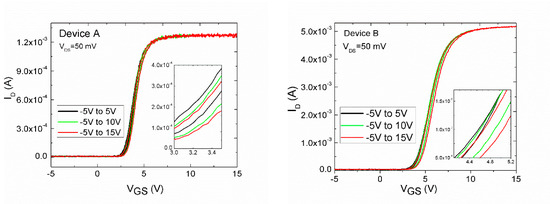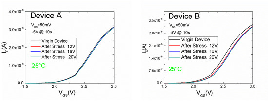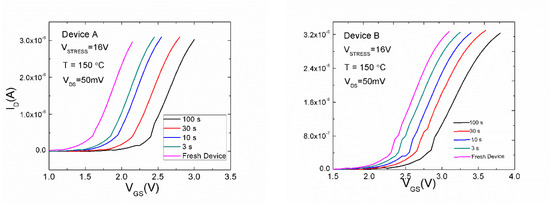 The BTI measurement procedure consists of three steps: initial stabilization, measurement of the ID–VGS reference curve, and multiple stress-sense measurements. Figure 3 depicts the progressions of ID–VGS curves with stress in the situation of each sample. Subsequently, at each stress period, the ID–VGS curves shifted toward the positive VGS direction, displaying clearly, a threshold voltage instability (similar behavior shown for the devices A and B).