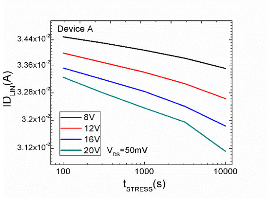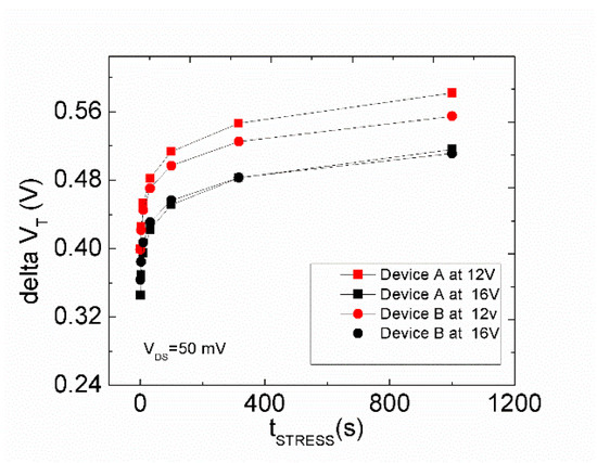 Figure 7 shows during the stress phase at diverse stress temperatures and voltages. In order to determine the evolution, the threshold degradation-time dependence was compared on both devices. Clearly, a good fit with the classic power law model is shown. Devices A and B showed the same in the gate bias regime when adopted values of 12, 16, and 20 V at 150 °C within the measurement window from 0 to 1000 s. The stress conditions were interrupted at fixed time intervals and measure ID at V and compared with the initial reference curve (similar behavior for the devices A and B).