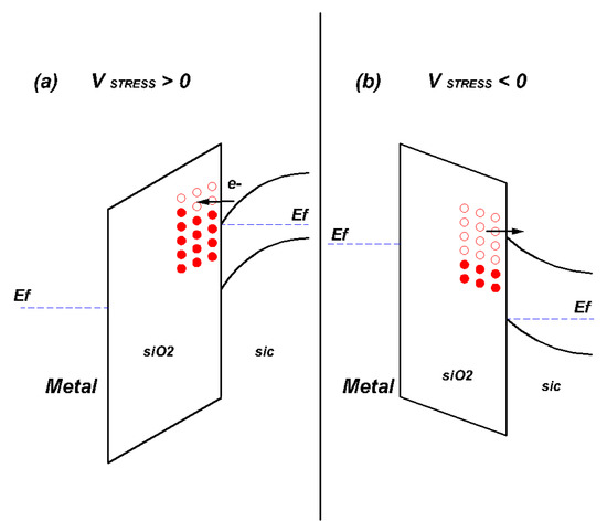 Representation of the sketch of the band diagram for the stress phase (a) and the recovery phase (b) obtained during the stress phase.