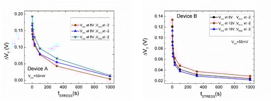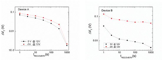 Two different values of have been used, as shown in Figure 10. Note that starts to recover immediately after stress when the devices are recovered at . It demonstrates very a similar impact of recovery for both devices, as shown in Figure 10.